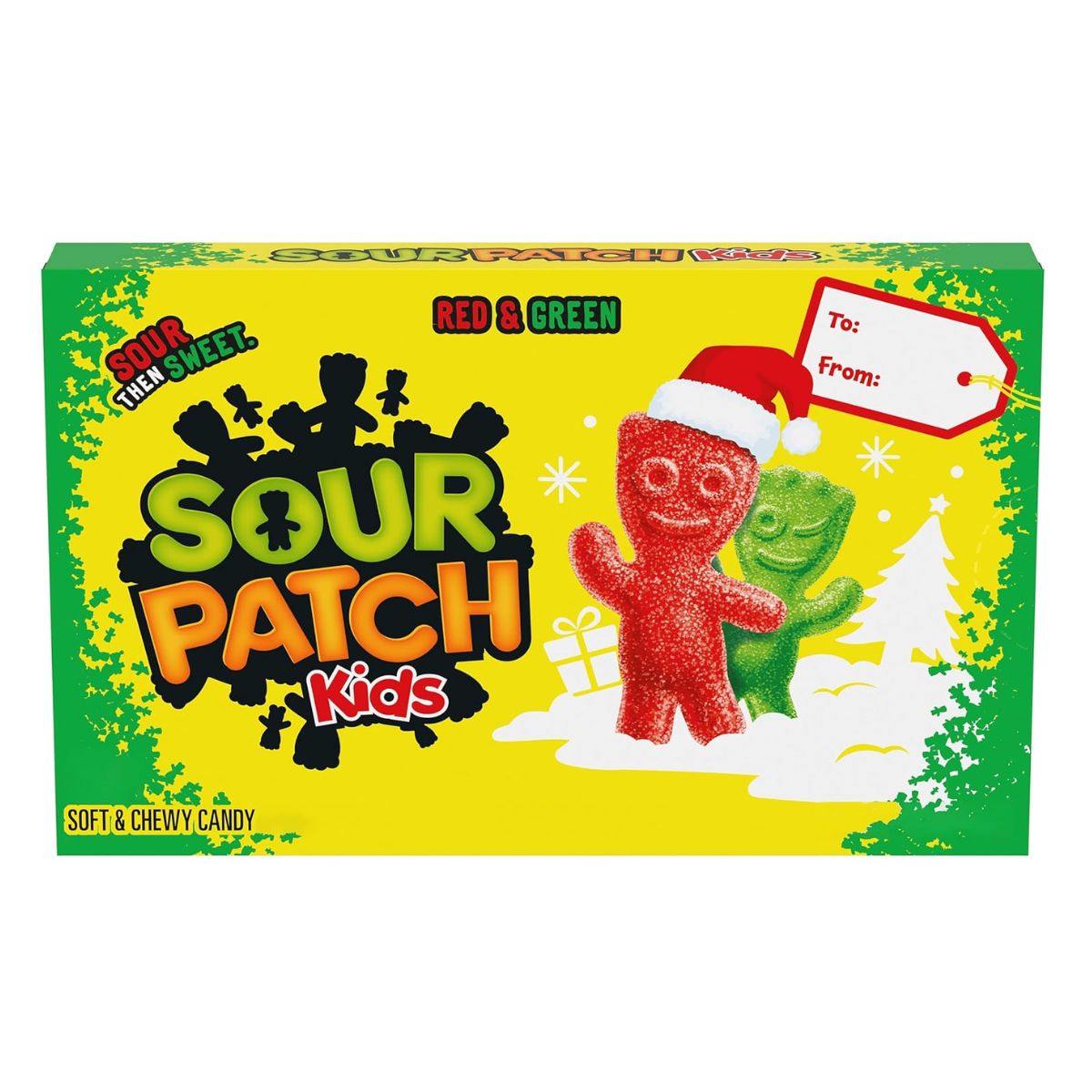 Espalhe um pouco de alegria natalina travessa com as balas de goma SOUR PATCH KIDS vermelhas e verdes, macias e mastigáveis.